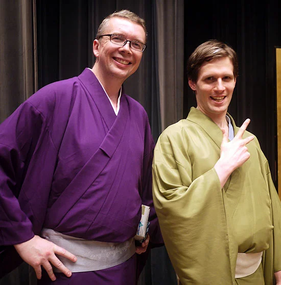 Jubei (right) as an amateur at the Chiba International Rakugo Competition with the author.